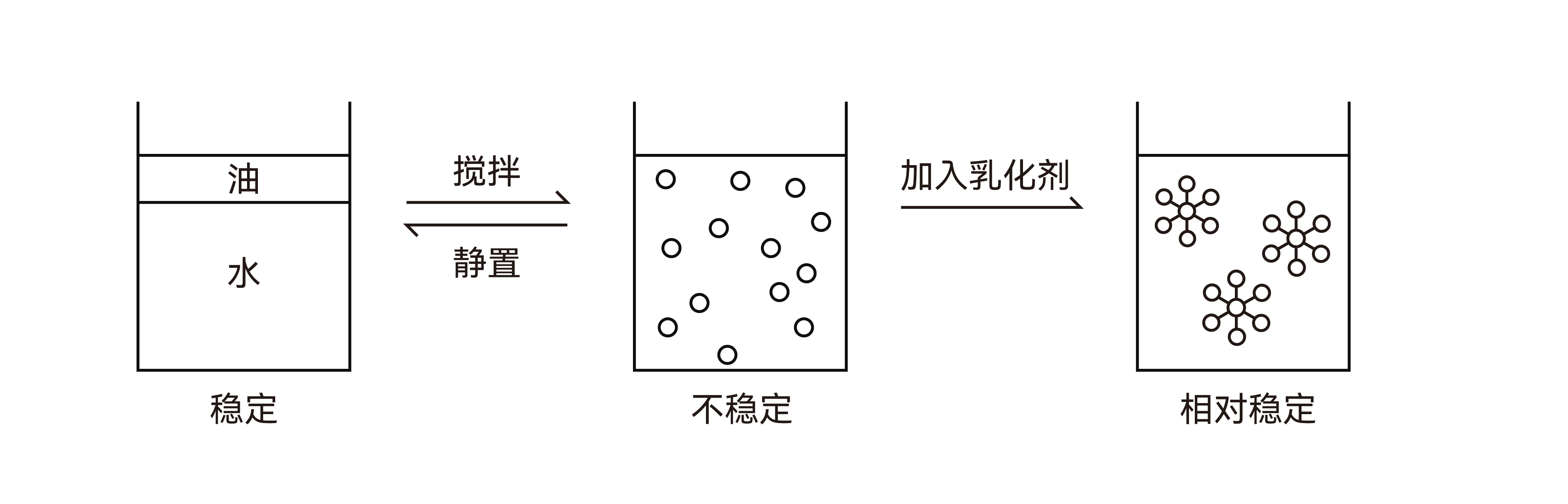 分層、變型和破乳。分層是由于分散相和分散介質(zhì)密度不同,出現(xiàn)分散微粒上升和下沉的現(xiàn)象;變型是乳狀液類型突然發(fā)生轉(zhuǎn)變;破乳是乳狀液體系完全破壞,分層與變形可同時(shí)發(fā)生。