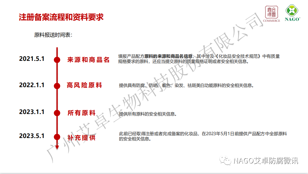 (3)自2023年1月1日起,注冊(cè)人備案人申請(qǐng)注冊(cè)或者進(jìn)行備案時(shí),應(yīng)當(dāng)按照《規(guī)定》的要求,提供全部原料的安全相關(guān)信息。此前已經(jīng)取得注冊(cè)或者完成備案的化妝品,注冊(cè)人、備案人應(yīng)當(dāng)在2023年5月1日前補(bǔ)充提供產(chǎn)品配方中全部原料的安全相關(guān)信息。