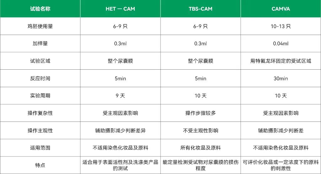 綜上所述,三種試驗(yàn)各有其優(yōu)缺點(diǎn)(見表1),各在不同維度對(duì)刺激性進(jìn)行評(píng)價(jià),在化妝品配方及原料篩選時(shí),可選用一種或者組合的形式對(duì)其進(jìn)行評(píng)價(jià),如HET-CAM與TBS-CAM試驗(yàn)的結(jié)合,可從血管效應(yīng)產(chǎn)生的快慢以及對(duì)實(shí)驗(yàn)損傷程度的量化兩個(gè)維度對(duì)受試物進(jìn)行評(píng)價(jià),也結(jié)合了主觀與客觀的評(píng)價(jià),減少誤差。